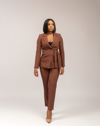 Introducing the Brown Wrap Style Suit Set – a refined ensemble designed to flatter every figure. With its wrap-style jacket and tailored trousers, this suit offers a sophisticated silhouette perfect for weddings, office settings, or upscale events.